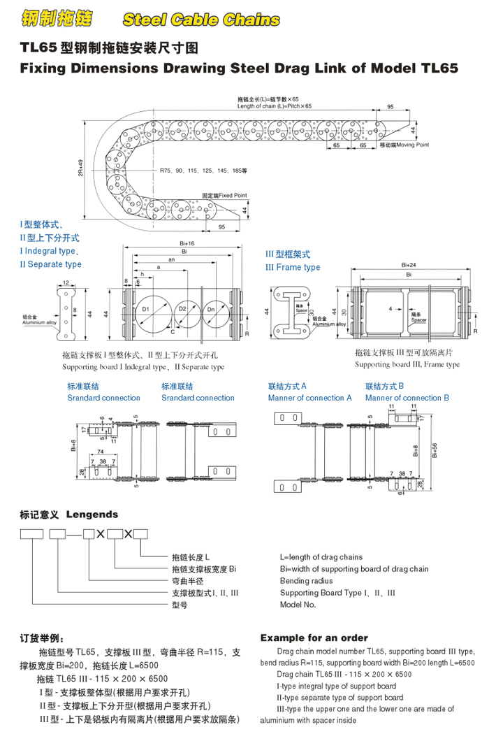 簡介:節(jié)距65mm,彎曲半徑有75,90,115,125,14,185.鏈板高度44mm,拖鏈最小寬度50mm.最大孔徑30mm。