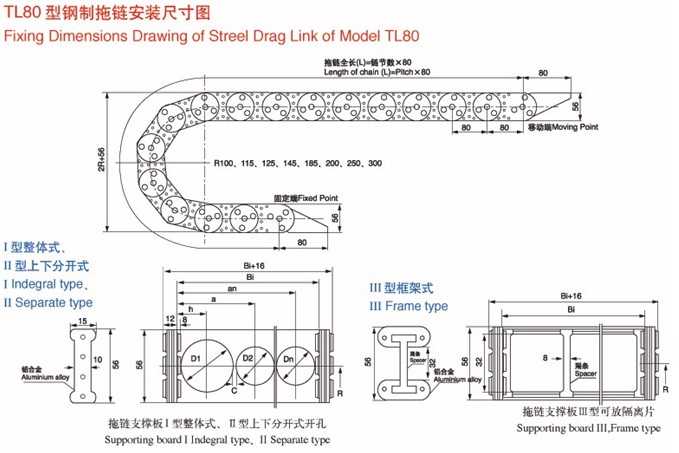 拖鏈型號(hào)TL80,支撐板Ⅲ型,彎曲半徑R=125,支撐板寬度Bi=200,拖鏈長(zhǎng)度L=6500