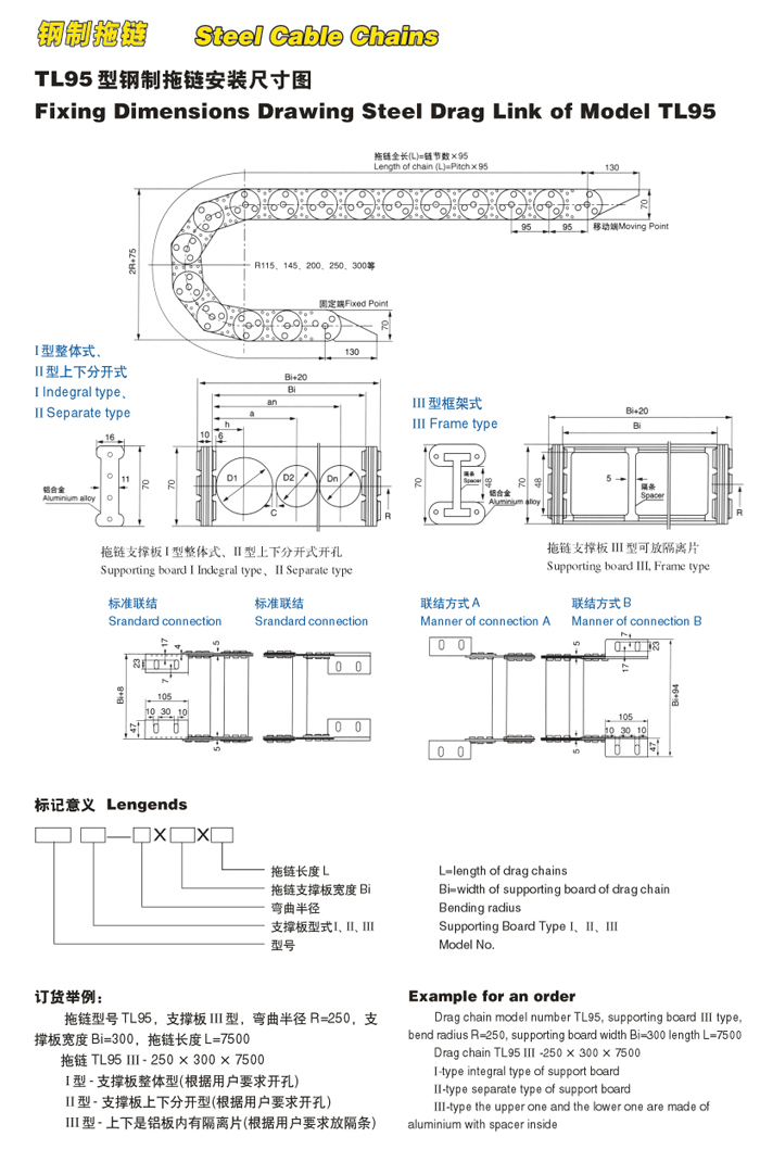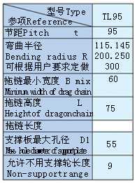 拖鏈型號(hào)TL95,支撐板Ⅲ型,彎曲半徑R=250,支撐板寬度Bi=300,拖鏈長(zhǎng)度L=7500