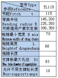 TL115III型鋼制拖鏈:簡介:節(jié)距115mm,彎曲半徑有145,200,225,250,300.鏈板高度86mm,拖鏈最小寬度80mm.內(nèi)高55mm。
