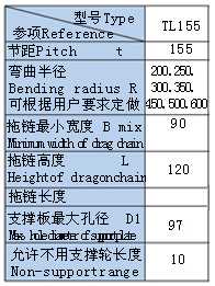 拖鏈型號TL155,支撐板Ⅲ型,彎曲半徑R=250,支撐板寬度Bi=300,拖鏈長度L=8800
